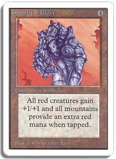 All red creatures gain +1/+1, and all mountains provide an extra red mana when tapped.