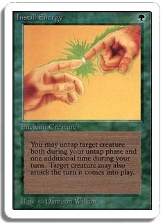 You may untap target creature both during your untap phase and one additional time during your turn. Target creature may attack the turn it comes into play.