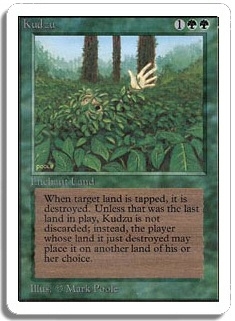 When target land becomes tapped, it is destroyed. Unless that was the last land in play, Kudzu is not discarded; instead the player whose land it just destroyed may place it on any other land in play.
