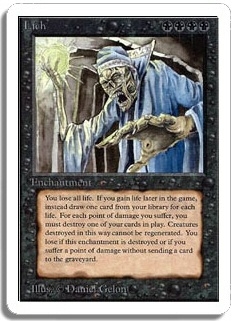 You lose all life. If you gain life later in the game, instead draw one card from your library for each life. For each point of damage you suffer, you must destroy one of your cards in play. Creatures destroyed in this way cannot be regenerated. You lose if this enchantment is destroyed or if you suffer a point of damage without sending a card to the graveyard.
