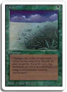 Changes the color of one card either being played or already in play to green. Cost to cast, tap, maintain, or use a special ability of target card remains entirely unchanged.
