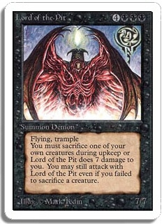 Flying, Trample. You must sacrifice one of your own creatures during upkeep or Lord of the Pit does 7 damage to you. You may still attack with Lord of the Pit even if you failed to sacrifice a creature.