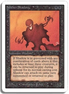 If Shadow is in graveyard with any combination of cards above it that includes at least three creatures, it can be returned to play during upkeep for its normal casting cost. Shadow can attack on same turn summoned or returned to play.