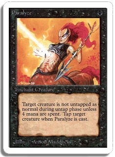 Target creature is not untapped as normal during untap phase unless 4 mana are spent. Tap target creature when Paralyze is cast.