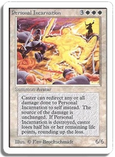 Caster can redirect any or all damage done to Personal Incarnation to self instead. The source of the damage is unchanged. If Personal Incarnation is destroyed, caster loses half his or her remaining life points, rounding up the loss.