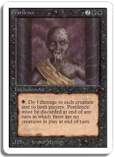 <B>: Do 1 damage to each creature and to both players. Pestilence must be discarded at end of any turn in which there are no creatures in play at end of turn.
