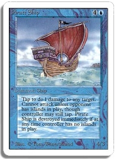 Tap to do 1 damage to any target. Cannot attack unless opponent has islands in play, though controller may still tap. Pirate Ship is destroyed immediately if at any time controller has no islands in play.