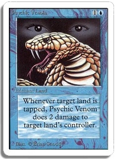 Whenever target land becomes tapped, Psychic Venom deals 2 damage to that land's controller.