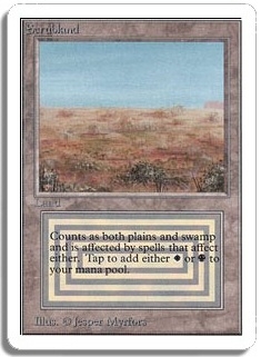 Counts as both plain and swamp and is affected by spells that affect either. Tap to add either <W> or <B> to your mana pool.