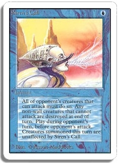 All of opponent's creatures that can attack must do so. Any non-wall creatures that cannot attack are destroyed at end of turn. Play only during opponent's turn, before opponent's attack. Creatures summoned this turn are unaffected by Siren's Call.