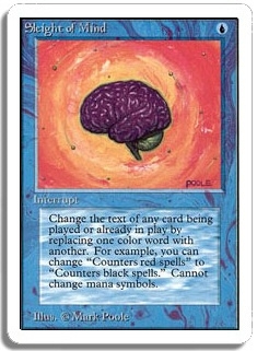 Change the text of any card being played or already in play by replacing one color word with another. For example, you can change "Counters red spells" to "Counters black spells". Cannot change mana symbols.