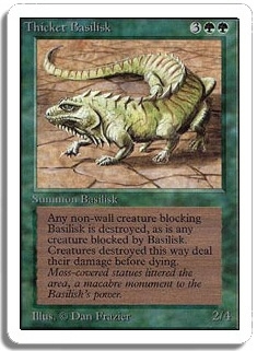 Any non-wall creature blocking Basilisk is destroyed, as is any creature blocked by Basilisk. Creatures destroyed this way deal their damage before dying.