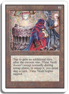 <T>: Gain an additional turn after the current one. Time Vault doesn't untap normally during untap phase; to untap it, you must skip a turn. Time Vault begins tapped.