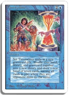 Set Timetwister aside in a new graveyard pile. Shuffle your hand, library, and graveyard together into a new library and draw a new hand of seven cards, leaving all cards in play where they are; opponent must do the same.