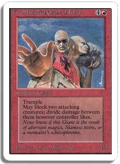 Trample. May block two attacking creatures; divide damage between them however controller likes.