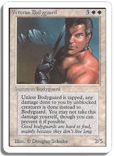 Unless Bodyguard is tapped, any damage done to you by unblocked creatures is done instead to Bodyguard. You may not take this damage yourself, though you can prevent it if possible.