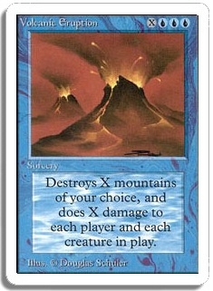 Destroys X mountains of your choice, and does X damage to each player and each creature in play.