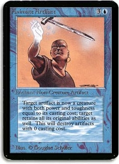 Target artifact is now a creature with both power and toughness equal to its casting cost; target retains all its original abilities as well. This will destroy artifacts with 0 casting cost.