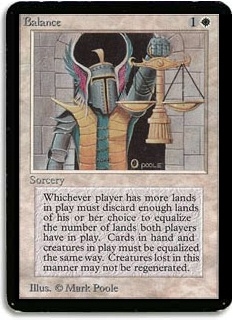 Whichever player has more lands in play must discard enough lands of his or her choice to equalize the number of lands both players have in play. Cards in hand and creatures in play must be equalized the same way. Creatures lost in this manner may not be regenerated.