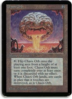 <1>: Flip Chaos Orb onto the playing area from a height of at least one foot. Chaos Orb must turn completely over at least once or it is discarded with no effect. When Chaos Orb lands, any cards in play that it touches are destroyed, as is Chaos Orb.