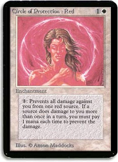 <1>: Prevents all damage against you from one red source. If a source does damage to you more than once in a turn, you must pay 1 mana each time you want to prevent the damage.