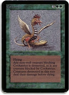 Flying. Any non-wall creature blocking Cockatrice is destroyed, as is any creature blocked by Cockatrice. Creatures destroyed in this way deal their damage before dying.