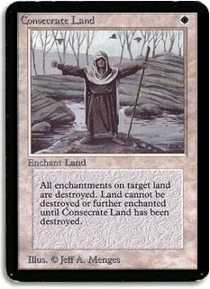 All enchantments on target land are destroyed. Land cannot be destroyed or further enchanted until Consecrate Land has been destroyed.
