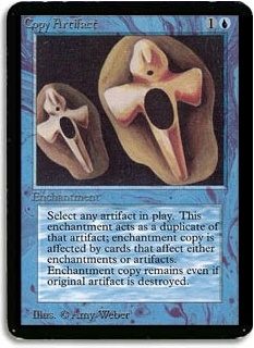 Select any artifact in play. This enchantment acts as a duplicate of that artifact; it is affected by cards that affect either enchantments or artifacts. The copy remains even if the original artifact is destroyed. Enchantments on the original artifact are not copied.