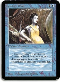 If target creature is destroyed, Creature Bond does an amount of damage equal to creature's toughness to creature's controller.
