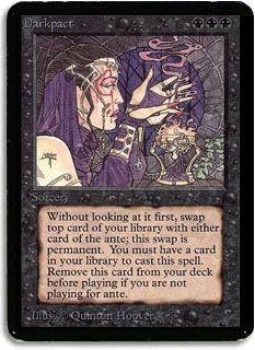 Without looking at it first, swap top card of your library with either card of ante; this swap is permanent. You must have a card in your library to cast this spell. Remove this card from your deck before playing if you are not playing for ante.