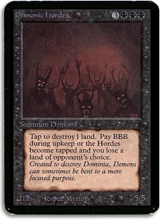 Tap to destroy 1 land. Pay <BBB> during upkeep or the Hordes become tapped and you lose a land of opponent's choice.