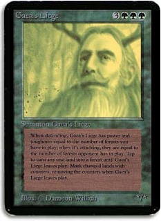 When defending, Gaea's Liege has power and toughness al to the number of forests you have in play; when it's acking, they are equal to the number of forests opponent in play. Tap to turn any one land into a forest until a's Liege leaves play. Mark changed lands with counters, oving counters when Gaea's Liege leaves play.