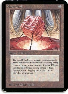 Tap to add 3 colorless mana to your mana pool. Mana Vault doesn't untap normally during untap phase; to untap it, you must pay 4 mana. If Mana Vault remains tapped during upkeep it does 1 damage to you. Tapping this artifact can be played as an interrupt.
