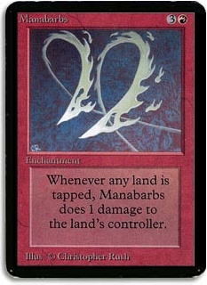 Whenever any land is tapped, Manabarbs does 1 damage to the land's controller.