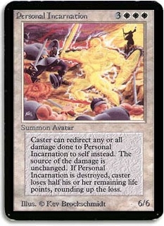 Caster can redirect any or all damage done to Personal Incarnation to self instead. The source of the damage is unchanged. If Personal Incarnation is destroyed, caster loses half his or her remaining life points, rounding up the loss.
