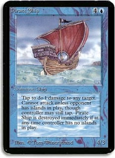 Tap to do 1 damage to any target. Cannot attack unless opponent has islands in play, though controller may still tap. Pirate Ship is destroyed immediately if at any time controller has no islands in play.