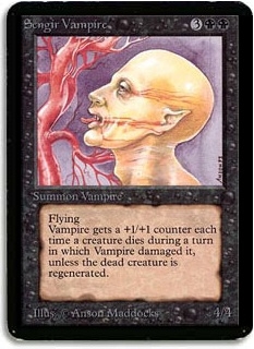 Flying. Vampire gets a +1/+1 counter each time a creature dies during a turn in which Vampire damaged it.