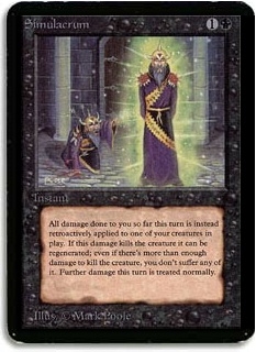 All damage done to you so far this turn is instead retroactively applied to one of your creatures in play. If this damage kills the creature it can be regenerated; even if there's more than enough damage to kill the creature, you don't suffer any of it. Further damage this turn is treated normally.