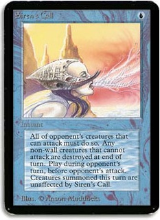 All of opponent's creatures that can attack must do so. Any non-wall creatures that cannot attack are destroyed at end of turn. Play only during opponent's turn, before opponent's attack. Creatures summoned this turn are unaffected by Siren's Call.