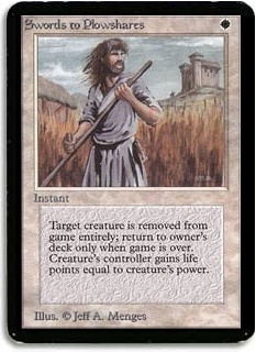 Target creature is removed from game entirely; return to owner's deck only when game is over. Creature's controller gains life points equal to creature's power.