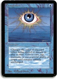 Changes the color of one card either being played or already in play to blue. Cost to cast, tap, maintain, or use a special ability of target card remains entirely unchanged.