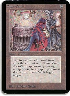 <T>: Gain an additional turn after the current one. Time Vault doesn't untap normally during untap phase; to untap it, you must skip a turn. Time Vault begins tapped.