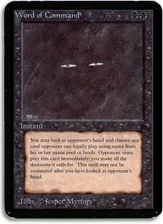 You may look at opponent's hand and choose any card opponent can legally play using mana from his or her mana pool or lands. Opponent must play this card immediately; you make all the decisions it calls for. This spell may not be countered after you have looked at opponent's hand.