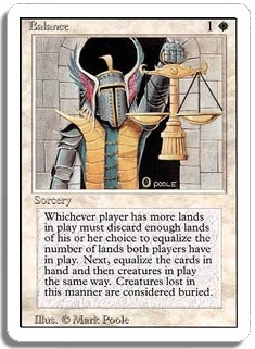 Whichever player has more lands in play must discard enough lands of his or her choice to equalize the number of lands both players have in play. Cards in hand and creatures in play must be equalized the same way. Creatures lost in this manner may not be regenerated.