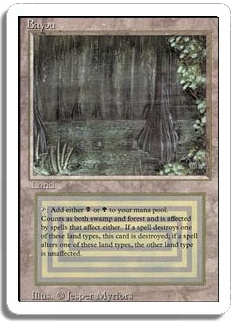 <T>: Add either <B> or <G> to your mana pool. Counts as both swamp and forest and is affected by spells that affect either. If a spell destroys one of these land types, this card is destroyed; if a spell alters one of these land types, the other land type is unaffected.