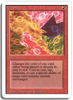 Changes the color of one card either being played or already in play to red. Cost to cast, tap, maintain, or use a special ability of target card remains entirely unchanged.