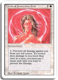 <1>: Prevents all damage against you from one red source. If a source does damage to you more than once in a turn, you must pay 1 mana each time you want to prevent the damage.