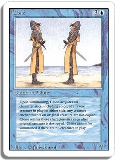 Upon summoning, Clone acquires all characteristics, including color, of any one creature in play on either side; any creature enchantments on original creature are not copied. Clone retains these characteristics even after original creature is destroyed. Clone cannot be summoned if there are no creatures in play.