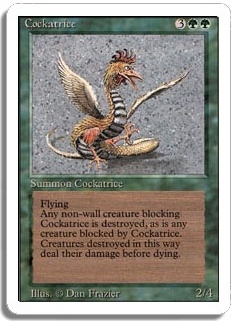 Flying. Any non-wall creature blocking Cockatrice is destroyed, as is any creature blocked by Cockatrice. Creatures destroyed in this way deal their damage before dying.