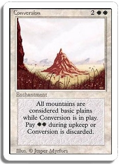 All mountains are considered basic plains while Conversion is in play. Pay <WW> during upkeep or Conversion is discarded.